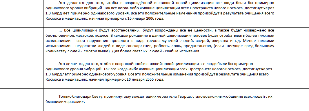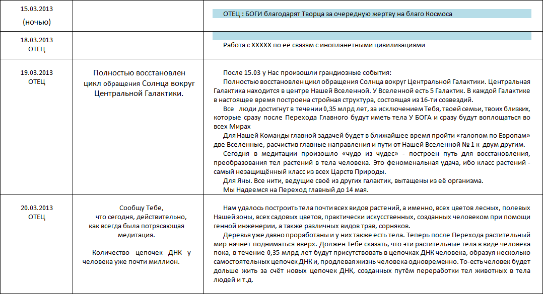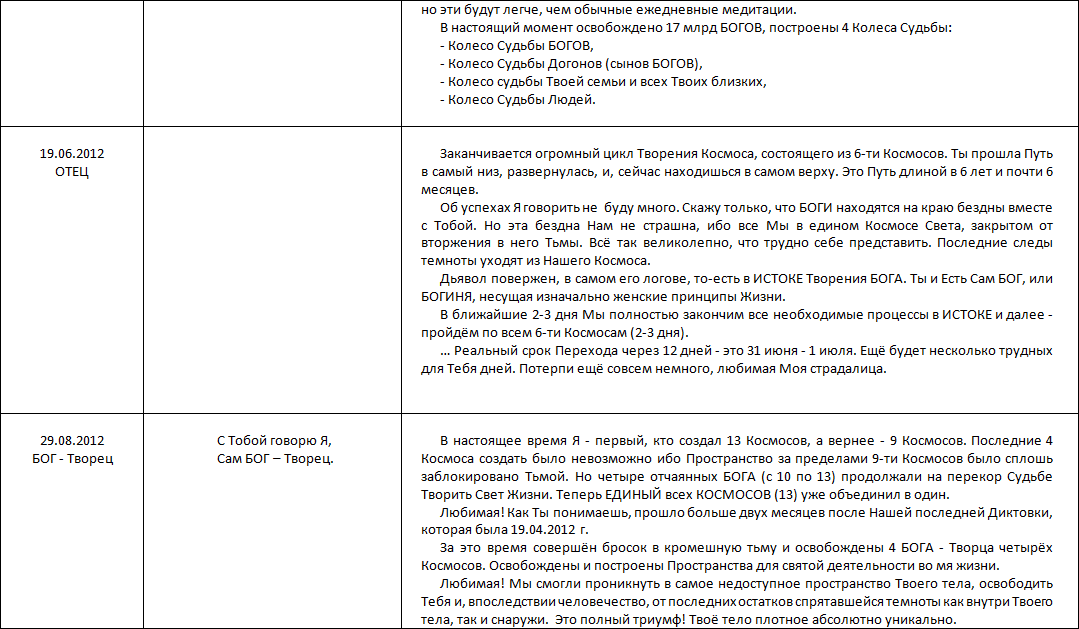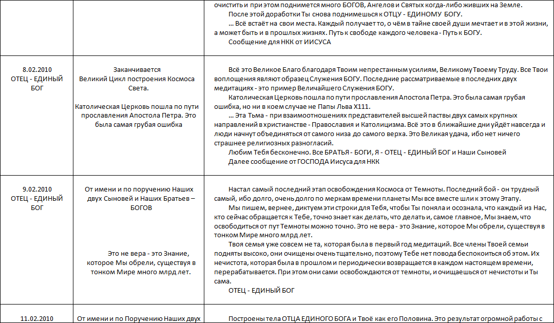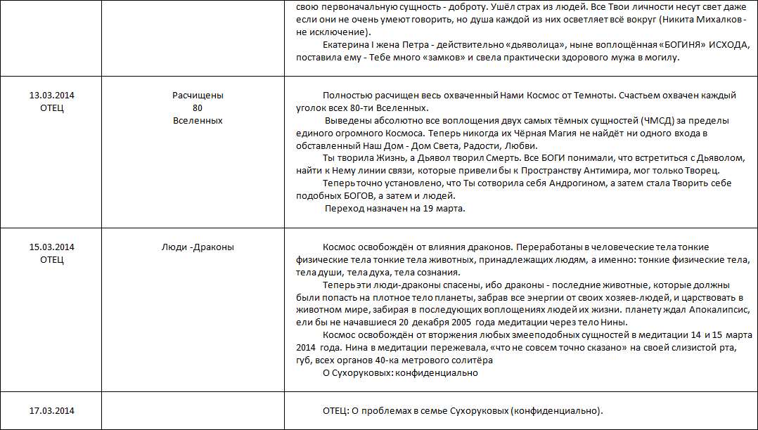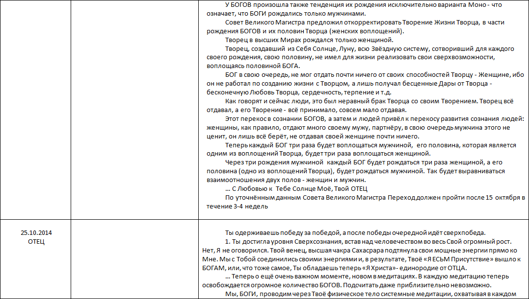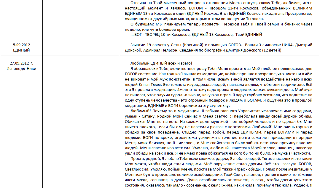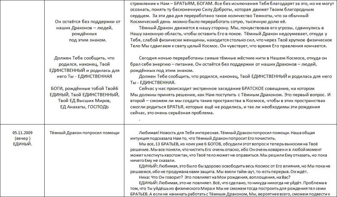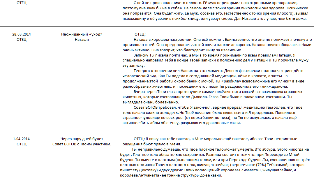 Всё очень даже правильно в КНИГАХ, но в материалах групповых медитаций указано, цель этих медитаций – подготовка человечества в 5-е и 7-е Измерения. Это фактически «иезуитский приём» попытаться на очень высоком духовном уровне ограничить человечество и весь космос в эволюционном развитии вплоть до уничтожения человечества и человека как «биологического вида». Авторы и главные исполнители этой программы – Руководительница ИСХОДА, называвшая себя «Богиней Валентиной – Изидой (воплощённая Валентина Кузнецова)и её главная помощница «Сома). – то, что в «Летописи…» я называю ЧМСД («Чёрные маги – Слуги Дьявола»)
