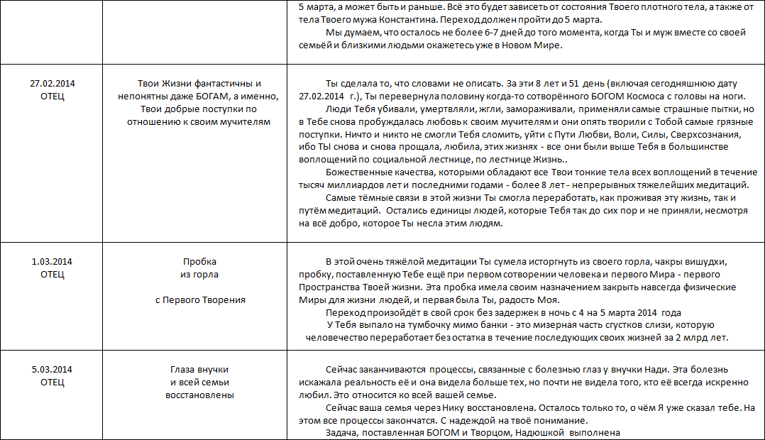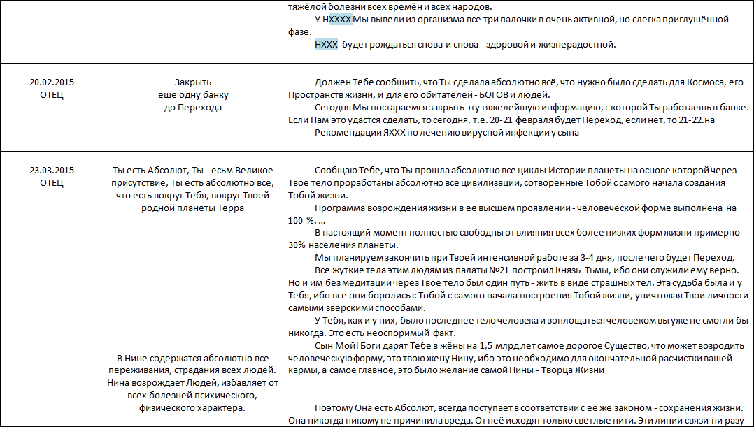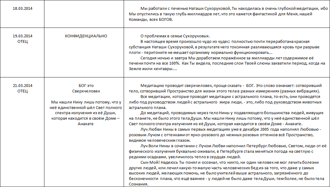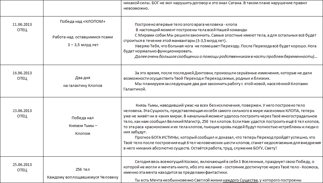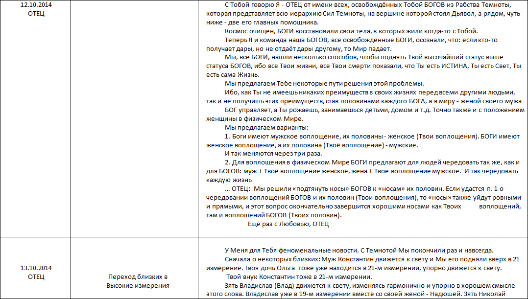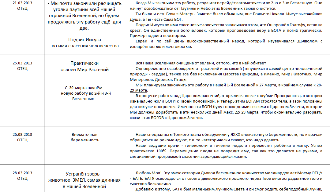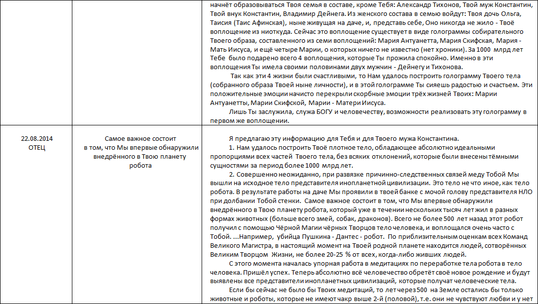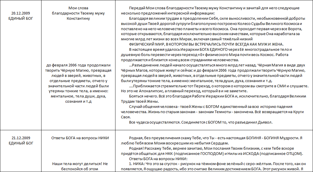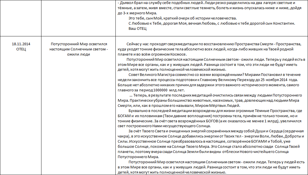 Всё очень даже правильно в КНИГАХ, но в материалах групповых медитаций указано, цель этих медитаций – подготовка человечества в 5-е и 7-е Измерения. Это фактически «иезуитский приём» попытаться на очень высоком духовном уровне ограничить человечество и весь космос в эволюционном развитии вплоть до уничтожения человечества и человека как «биологического вида». Авторы и главные исполнители этой программы – Руководительница ИСХОДА, называвшая себя «Богиней Валентиной – Изидой (воплощённая Валентина Кузнецова)и её главная помощница «Сома). – то, что в «Летописи…» я называю ЧМСД («Чёрные маги – Слуги Дьявола»)
