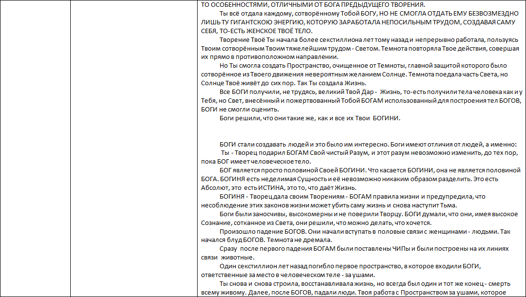Человечество стало развиваться по своим законам, нарушая Законы БОГИНИ и БОГА. Произошло разъединение сердца, души, духа и сознания людей, нарушилась связь человечества с Небесной Иерархией. Высший Разум стал недоступен сознанию людей. Душевные и духовные ценности, которыми люди могли обладать, получая Божественные энергии из Тонкого мира, стали недоступными для людей ввиду разъединения Тонкого и физического Миров. Произошла деградация человеческих тел, подмена духовных ценностей на материальные. Мозг у людей стал функционировать всего на несколько процентов, перестала работать интуиция.
