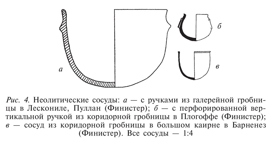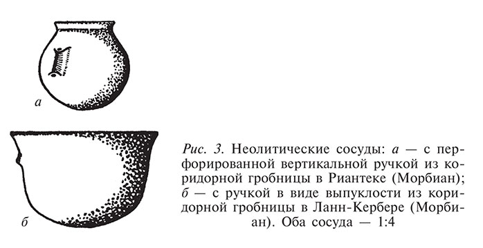 Хотя большая часть сосудов с насечками принадлежит к поздним неолитическим культурам, есть некоторые изделия, которые могут быть причислены к истинному неолиту. К этой категории можно отнести некоторые гончарные изделия с декорированием в виде треугольников и квадратов. Небольшой сосуд из коридорной гробницы в Эр-Map, Крак (Морбиан), декорированный квадратами, определенно принадлежит к истинному неолиту (фото 3). Точно так же можно причислить к этому периоду небольшой сосуд идентичной формы и состава глины, найденный в коридорной гробнице в Риантеке (Морбиан) (фото 4). Этот сосуд украшен двойными фестонами. Несколько фрагментов, найденных в нижнем уровне в коридорной гробнице D в каирне Барненез (Финистер), несут тот же узор. Фестоны и листья папоротника на большом сосуде из коридорной гробницы в Пенкер-Блоа (Финистер) напоминают узор на этом сосуде, но выполнен он рельефно.