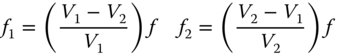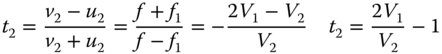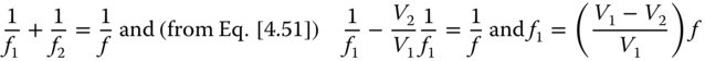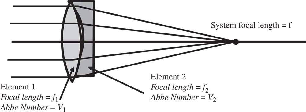 From Eq. (4.51), it is clear that the ratio of the two focal lengths should be minus the inverse of the ratio of their respective Abbe numbers. In other words, the ratio of their powers should be minus the ratio of their Abbe numbers. The power of the system comprising the two lenses is, in the thin lens approximation, simply equal to the sum of their individual powers. Therefore, it is possible to calculate these individual focal lengths, f1 and f2, in terms of the desired system focal length of f: