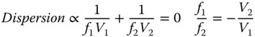 The first element, often (on account of its shape) referred to as the ‘crown element’, is a high power positive lens with low dispersion. The second element is a low power negative lens with high dispersion. The focal lengths of the two elements are f1 and f2 respectively and their Abbe numbers V1 and V2. Since the intention is that the dispersions of the two elements should entirely cancel, this condition constrains the relative power of the two elements. Individually, the dispersion as measured by the difference in optical power between the red and blue wavelengths is proportional to the reciprocal of the focal power and the Abbe number for each element. Therefore: