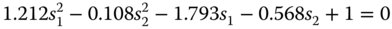We now substitute the conjugate parameter values together with the refractive index values (ND) into Eq. (4.30a). We sum the contributions of the two lenses giving the total spherical aberration which we set to zero. Calculating all coefficients we get a quadratic equation in terms of the two shape factors, s1 and s2.