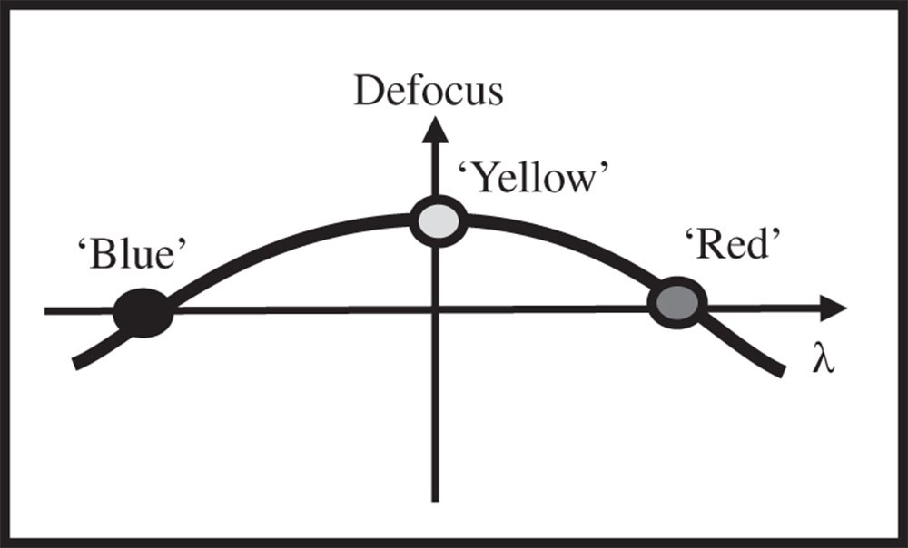The previous analysis of the achromatic doublet provides a means of ameliorating the impact of glass dispersion and to provide correction at two wavelengths. In the case of the standard visible achromat, correction is provided at the F and C wavelengths, the two hydrogen lines at 486.1 and 656.3 nm. Unfortunately, however, this does not guarantee correction at other, intermediate wavelengths. If one views dispersion of optical materials as a ‘small signal’ problem, and that any difference in refractive index is small across the region of interest, then correction of the chromatic focal shift with a doublet may be regarded as a ‘linear process’. That is to say we might approximate the dispersion of an optical material by some pseudo-linear function of wavelength, ignoring higher order terms. However, by ignoring these higher order terms, some residual chromatic aberration remains. This effect is referred to as secondary colour. The effect is illustrated schematically in Figure 4.26 which shows the shift in focus as a function of wavelength.