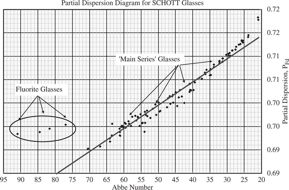 As indicated previously, Figure 4.27 exemplifies the close link between primary and secondary dispersion, with a linear trend observed linking the partial dispersion and the Abbe number for most glasses. It is easy to demonstrate by presenting Eqs. (4.59a)–(4.59c) in matrix form that, if a wholly linear relationship exists between partial dispersion and Abbe number, then the matrix determinant will be zero. In this instance, a triplet solution is therefore impossible. Furthermore, the same analysis suggests that for a set of glasses lying close to a straight line on the partial dispersion plot will necessitate the deployment of lenses with very high countervailing powers. It is clear, therefore, that an optimum triplet design is afforded by selection of glasses that depart as far as possible from a straight-line plot on the partial dispersion diagram. In this context, the isolated group of glasses that appear in Figure 4.27, the fluorite glasses, are especially useful in correcting for secondary colour. These glasses lie particularly far from the general trend line for the ‘main series’ of glasses. Lenses which are corrected for both primary and secondary colour are referred to as apochromatic lenses. These lenses invariably incorporate fluorite glasses.