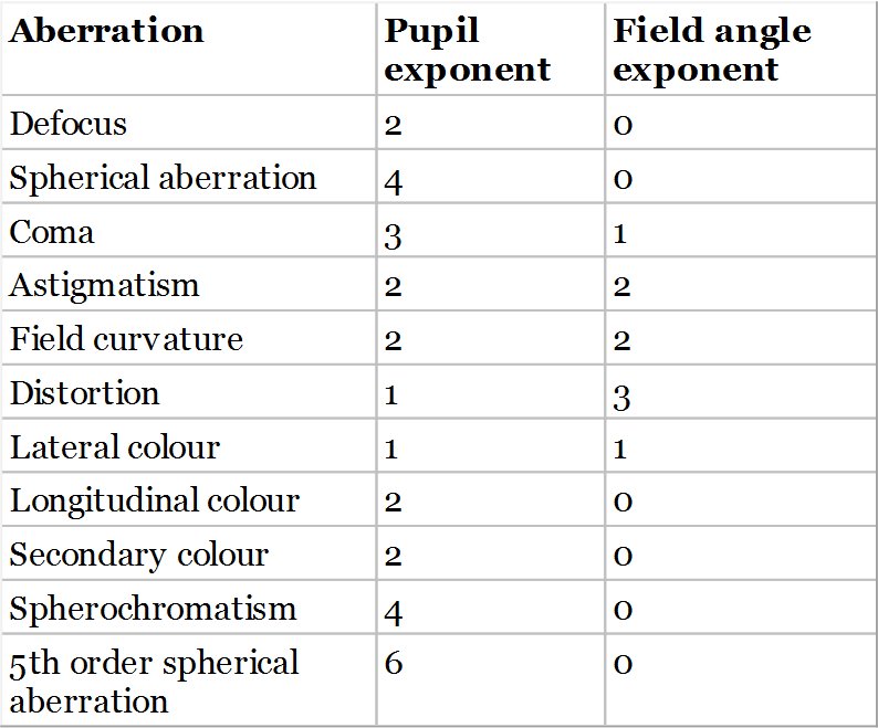 With these comments in mind, it would be useful to summarise all the aberrations covered in this chapter and to classify them by virtue of their pupil and field angle dependence. Table 4.1 sets out the wavefront error dependence upon pupil and field angle for each of the aberrations.