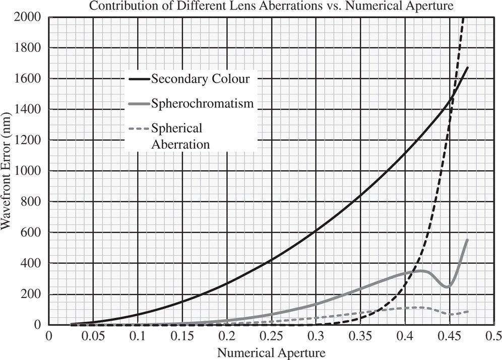 It is clear that for the simple achromat under consideration, at least for modest lens apertures, the impact of secondary colour predominates. If a wavefront error of about 50 nm is consistent with ‘high quality’ imaging, then secondary colour has a significant impact for numerical apertures in excess of 0.05 or f#10. With numerical apertures in excess of 0.2 (f#2.5), higher order spherical aberration starts to make a significant contribution. On the other hand the effect of spherochromatism is more modest throughout. In this context, the impact of spherochromatism would only be a significant issue if secondary colour were first corrected.