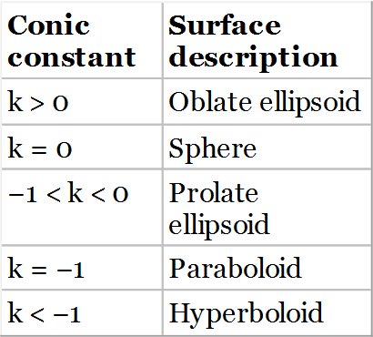 Without the further addition of the even polynomial coefficients, αn, the surfaces are pure conics. Historically, the paraboloid, as a parabolic mirror shape, has found application as an objective in reflective telescopes. As will be seen subsequently, use of a parabolic mirror shape entirely eliminates spherical aberration for the infinite conjugate. The introduction of the even aspheric terms add further useful variables in optimisation of a design. However, this flexibility comes at the cost of an increase in manufacturing complexity and cost. Strictly speaking, at the first approximation, the terms, α1 and α2 are redundant for a general conic shape. Adding the conic term, k, to the surface prescription and optimising effectively allows local correction of the wavefront to the fourth order in r. In this context, the first two even polynomial terms are, to a significant degree, redundant.