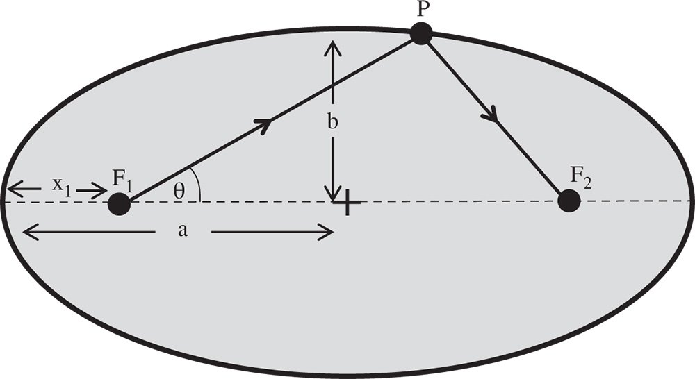 The ellipsoid is defined by its two foci, F1 and F2. In this instance, the shape of the ellipsoid is defined by its semi-major distance, a, and its semi-minor distance, b. As suggested, the key point about the ellipsoid shape sketched in Figure 5.1 is that the aggregate distance F1P + PF2 is always constant. By virtue of Fermat's principle, this inevitably implies that, since the optical path is the same in all cases, F1 and F2, from an optical perspective, represent perfect focal points with no aberration whatsoever generated by reflection from the ellipsoidal surface. In describing the ellipsoid above, it is useful to express it in terms of polar coordinates defined with respect to the focal points. If we label the distance F1P as d, then this distance may be expressed in the following way in terms of the polar angle, θ: