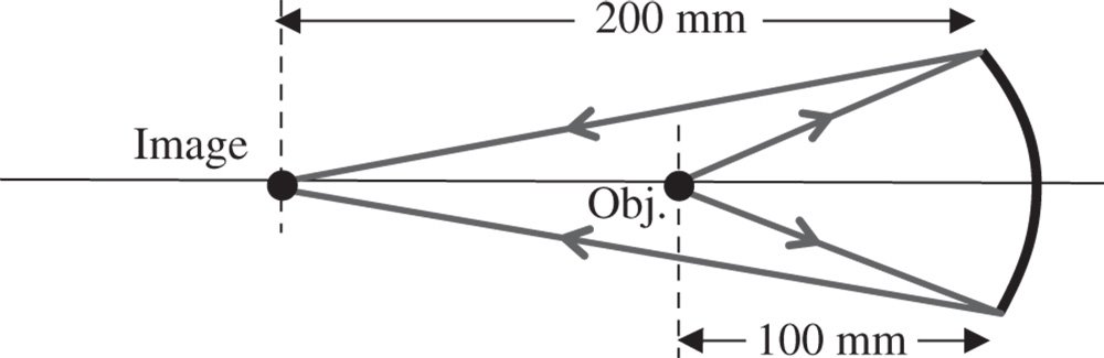 It is assumed that object and image are located the same side of the mirror, so that, in this context, the image distance is −200 mm. The overall set up is illustrated in the diagram: