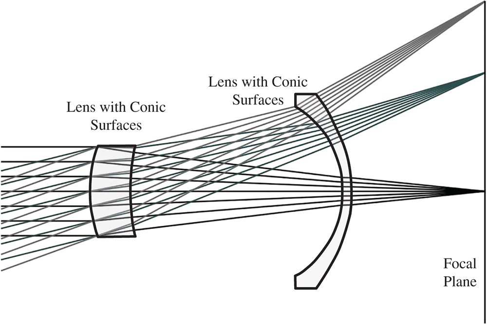 There is no generic rule for conic refracting surfaces that generate perfect image formation for an arbitrary conjugate. However, there is a special condition for the infinite conjugate where perfect image formation results, as illustrated in Figure 5.2.