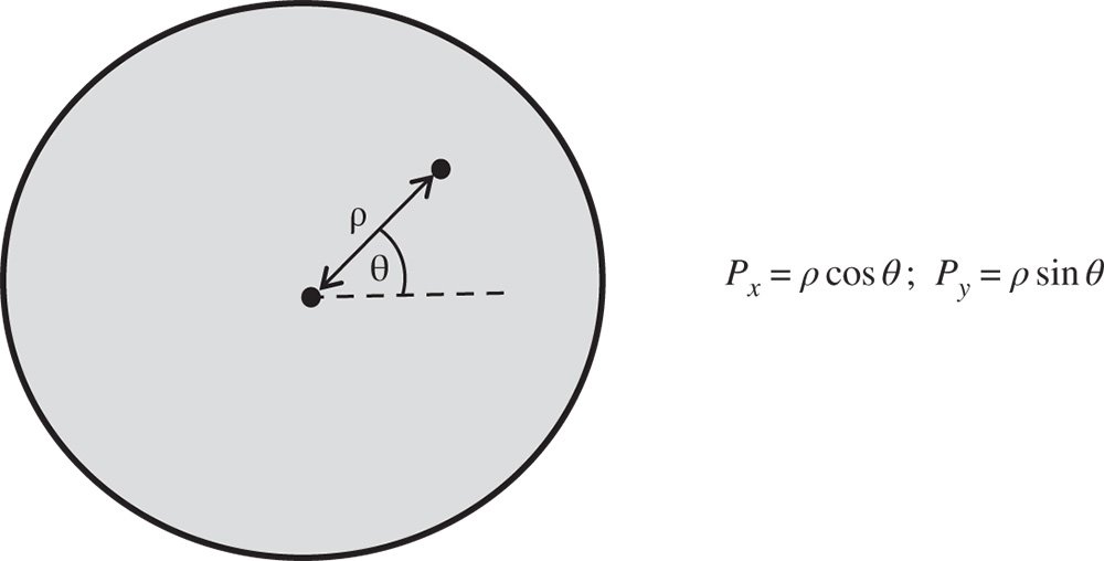 In describing wavefront aberrations at any surface in a system, it is convenient to do so by expressing their value in terms of the two components of normalised pupil functions Px and Py. Where the magnitude of the pupil function is equal to unity, this describes the position of a ray at the edge of the pupil. With this description in mind, we now proceed to describe the normalised pupil position in terms of the polar co-ordinates, ρ and θ. This is illustrated in Figure 5.4.