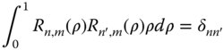 The parameter, Nn,m, is a normalisation factor. Of course, any arbitrary scaling factor may be applied to the coefficients, Cn,m,i, provided it is compensated by the normalisation factor. By convention, the base polynomial has a value of unity for ρ = 1. Of course, with this in mind, the purpose of the normalisation factor is to ensure that, in all cases, the rms value of the polynomial is normalised to one. It now remains only to calculate the values of the coefficients, Cn,m,i. These are determined from the condition of orthogonality which applies separately for Rn,m(ρ) and may be set out as follows: