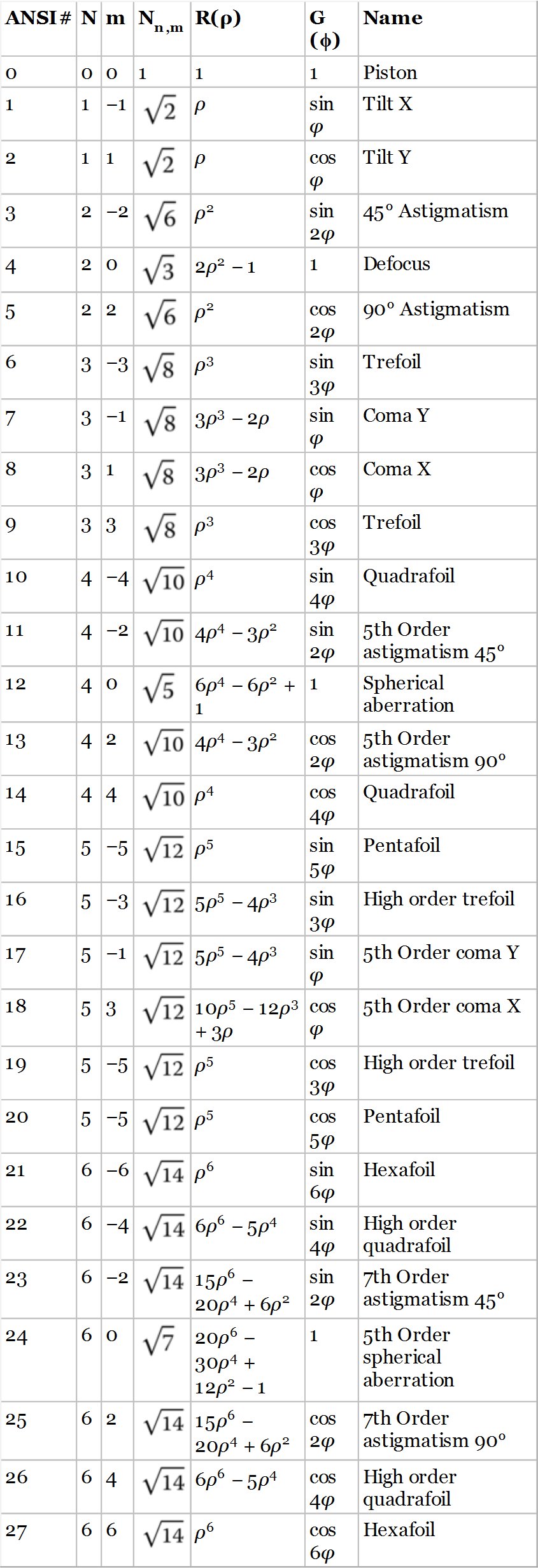 Table 5.2 First 28 Zernike polynomials.