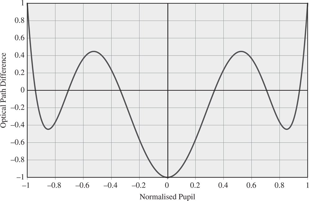 For the fifth order spherical aberration, the rms wavefront error has been reduced by a factor of 20 through the process of aberration balancing. In terms of the practical application of this process, one might wish to optimise an optical design by minimising the rms wavefront error. Although, in practice, the process of optimisation will be carried out using software tools, nonetheless, it is useful to recognise some key features of an optimised design. By virtue of the previous example, optimisation of spherical aberration should lead to an OPD profile that is close to the 5th order Zernike term. This is shown in Figure 5.5 which illustrates the profile of an optimised OPD based entirely on the relevant fifth order Zernike term. The graph plots the nominal OPD again the normalised pupil function with the form given by the Zernike polynomial, n = 6, m = 0.