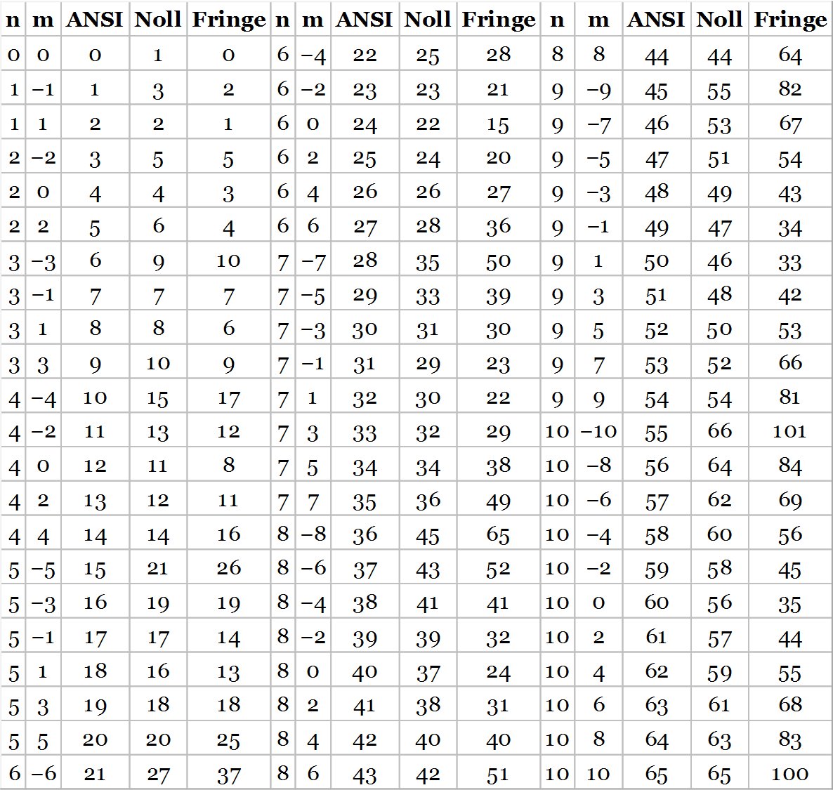 Table 5.4 Comparison of Zernike numbering systems.