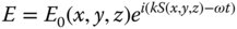E0(x, y, z) is a slowly varying envelope function and S(x, y, z) is the spatially varying phase of the wave. In fact S(x, y, z) has dimensions of length and when it is equal to the wavelength the phase term it describes is equal to 2π. The angular frequency is denoted by ω and the spatial frequency by k.