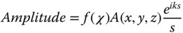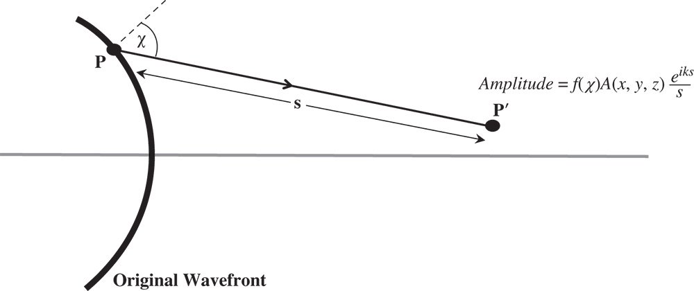 Figure 6.2 describes the contribution to the wave amplitude at point P′ made by a single point, P, on the original wavefront. The original wavefront has an amplitude, A(x, y, z) which may be complex. The angle, χ, is the angle the line from P to P′ makes to the normal to the wavefront. As indicated in Figure 6.2, there is some dependence of the secondary wave amplitude upon this angle, in the form of f(χ). There is no intuitive process that can shed further light on the precise form of this function. Elucidation of this can only be provided by a proper application of Maxwell's equation. Re-iterating the description of the Huygens' representation in Figure 6.2, it can be described more formally, as in Eq. (6.7).