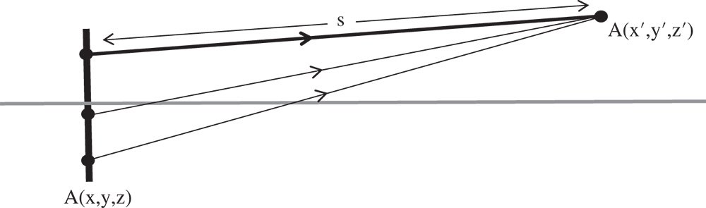Proper application of Maxwell's equations gives rise to a series of equations that are similar in form to the Huygens' representation shown in Eq. (6.7). These include the so-called Rayleigh diffraction formulae of the first and second kinds. In the first case, it is assumed that the amplitude of the wave disturbance A(x, y, z) is known across some semi-infinite plane. We now seek to determine the amplitude, A(x′, y′, z′) at some other point in space. The geometry of this is illustrated in Figure 6.3.