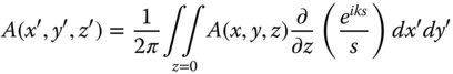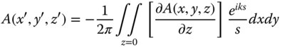 Equation (6.8) is referred to as the Rayleigh diffraction formula of the first kind. In form, Eq. (6.8) is very similar to what one might expect from the summation of an expression of the form shown in the Huygens' representation in Eq. (6.7). We have formally expressed the summation of the Huygens wavelets as a surface integral over the plane, as shown in Figure 6.3. Note, however, instead of the decay of the wavelet amplitude with distance being expressed as in Eq. (6.7), a differential with respect to the axial distance is added. This is crucial, since it gives an insight into the formulation of the inclination term f(χ) which will be explored further a little later.