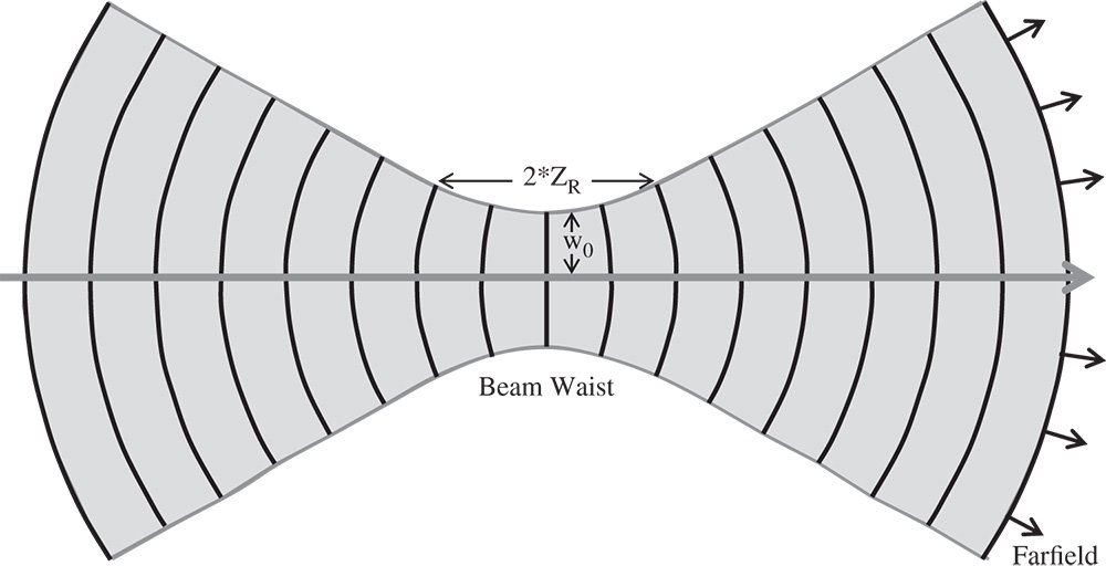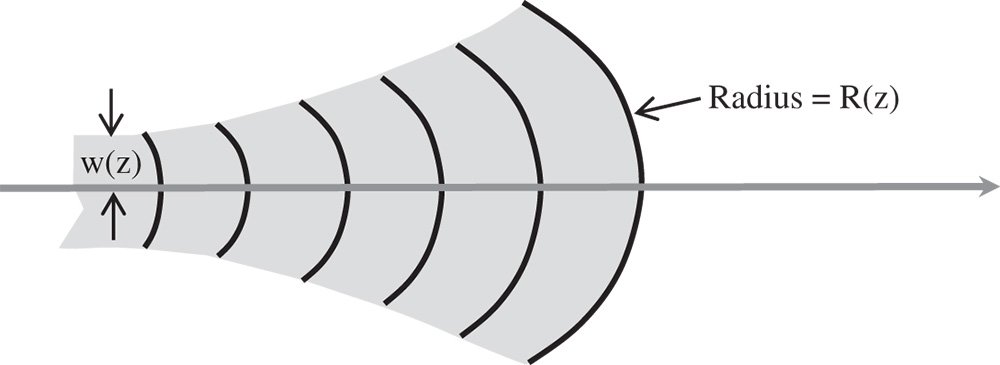 As suggested, in the case of a Gaussian beam, the amplitude may be expressed a characteristic width, w(z) which varies slowly with respect to z. Most significantly, w(z) can be complex, giving rise to wavefront curvature. This may be easily seen if the complex part of the envelope is subsumed within the sinusoidal propagation term, leading to a quadratic phase variation across the beam. In the Fresnel and paraxial approximation, these quadratic wavefronts may be viewed as approximately spherical. This is illustrated in Figure 6.12.