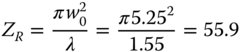 In the previous worked example, we introduced a fibre laser with a wavelength of 1.55 μm, with a Gaussian beam size of 5.25 μm. If we assume that the beam waist is located at the exit from the fibre, what is the Rayleigh distance of the laser beam? In addition, what is the beam size, w(z), 50 μm from the exit from the fibre and what is the wavefront radius at that location?