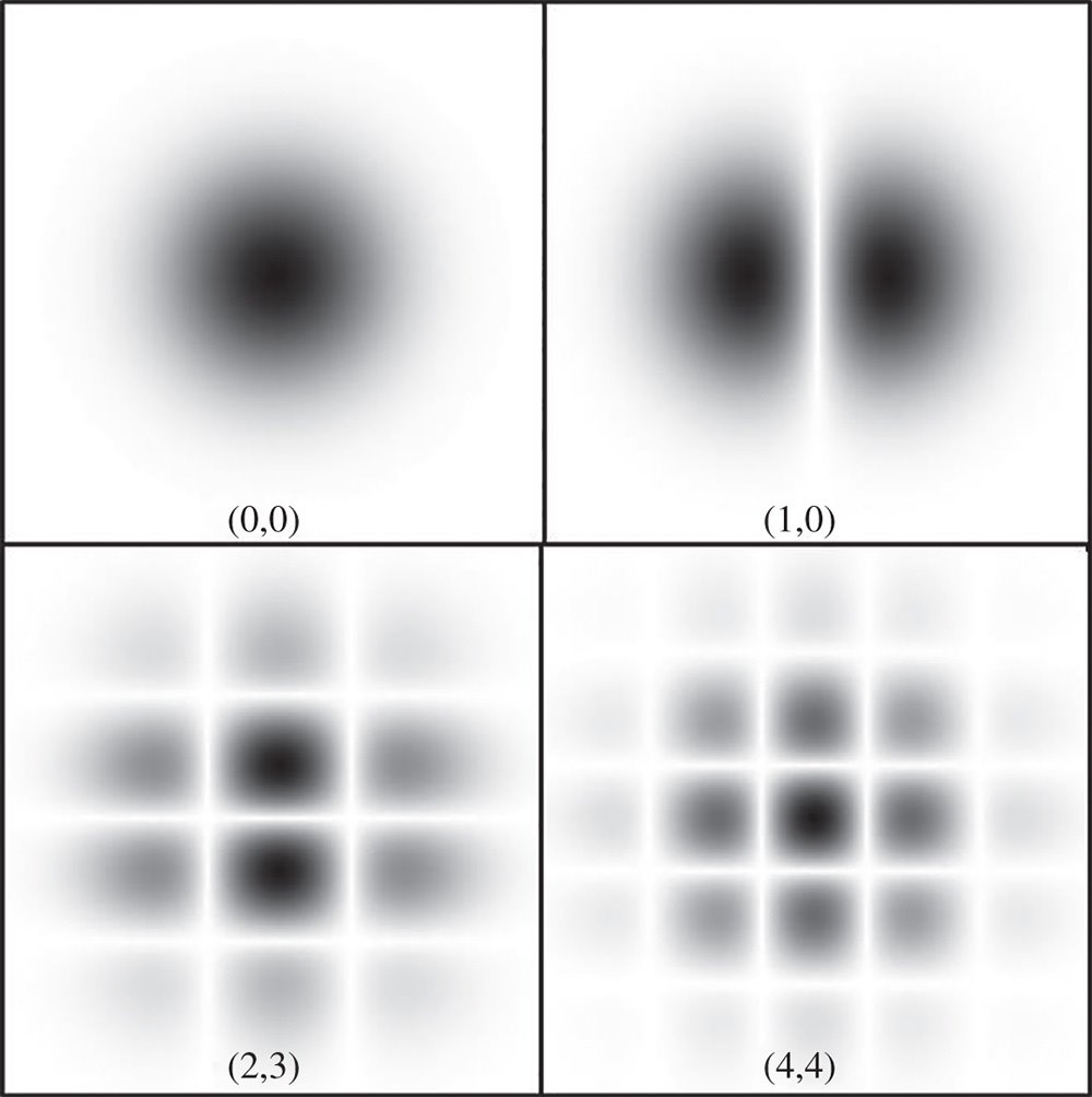 Further exploring the theme of multiple modes as individual solutions to the wave equation, we must recognise that the simple Gaussian beam previously defined is not the only solution to the paraxial Helmholtz equation. In fact, a complete set of orthonormal solutions exist of which the simple Gaussian solution is the first member. Orthonormal, in this context, means that the cross-integral of two different solutions is always zero and that involving the same solutions is always unity. This is an important property, as will be seen later. This set of solutions are defined by the Hermite-Gaussian polynomials, where the original Gaussian amplitude envelope is multiplied by a unique Hermite polynomial in x and y. Each Hermite polynomial solution is defined by its maximum order in x and y, which we will refer to as l and m respectively. Overall, the solution may be represented as: