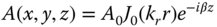 An interesting solution to the paraxial Helmholtz equation, Eq. (6.31), is the so-called Bessel beam. Generally, Bessel functions of the first kind form a series of solutions to the equation. Most specifically for an axially symmetric form, the solution is represented by a Bessel function of the first kind and zeroth order. The unique feature of this solution is that the wavefronts are planar and the amplitude envelope of the beam does not change as it propagates. That is to say, the beam appears to be diffractionless and does not diverge. The solution is of the form given by: