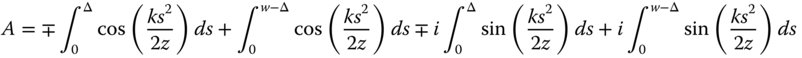 When Δ is large and positive, the integral part of Eq. (6.57) cancels out the constant asymptotic values, so the amplitude is zero. Of course, that the amplitude is zero away from the illuminated portion of the slit is to be expected. In the opposite scenario, where a position within the illuminated area is viewed, then the flux levels tend to a uniform value. Around the edge position, and towards the illuminated area, a series of light and dark bands emerge. One can see from the disposition of the Cornu spiral, that the contrast of these bands diminishes as the effective Fresnel zone number increases and, from Eq. (6.52), they also become more tightly packed.