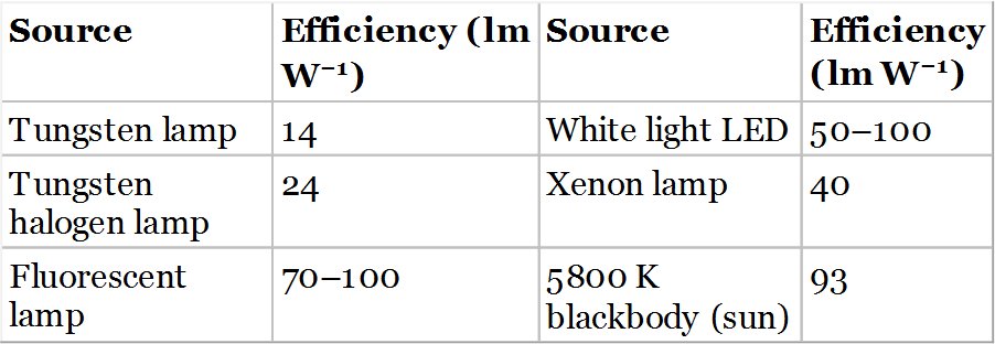 In fact, the luminous efficiency of a blackbody source may be calculated directly from the Planck distribution set out in Eq. (7.9) and the luminous efficiency function, V(λ). The plot is shown in Figure 7.21. The peak efficiency occurs around 6000 K and it is, of course, no coincidence that this is close to the solar blackbody temperature of 5800 K. Clearly, the human eye has been ‘designed’ to efficiently harvest light from its primary illumination source.