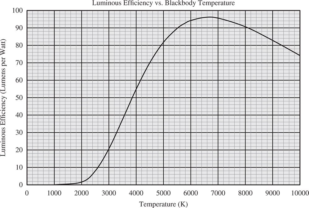 Figure 7.21 Luminous efficiency vs. blackbody temperature.