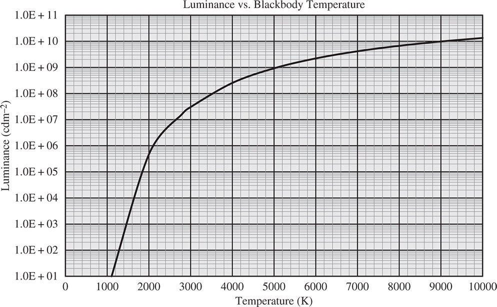 The brightness of different sources (to the human eye), or luminance, is expressed in candelas per square metre or nits. Representative values range from 80 cdm−2 for a typical cinema screen to 7 × 106 cdm−2 for the filament of an incandescent lamp and 1.6 × 109 cdm−2 for the solar disk. As for the luminous efficiency plot, the luminance of a blackbody source may be derived directly from the Planck distribution and the luminous efficiency curve, V(λ). This plot is shown in Figure 7.22.