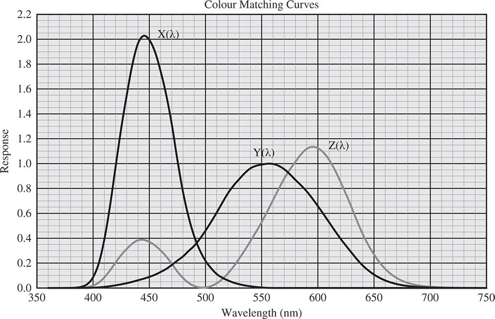 The preceding discussion has been wholly concerned with the level of illumination rather than (human) perception of the spectral distribution. This spectral distribution is described by the notion of colour, as perceived by humans. From the perspective of human vision, colour is discerned by the relative stimulation of three types of colour receptors (the cones). To model this process, the CIE, in 1931, proposed a set of colour matching functions, effectively mimicking the relative sensitivity of each type of sensor. The colour matching functions are represented as three separate curves, x(λ), y(λ), and z(λ), and operate, in principle, in a similar manner to the V(λ) curve for photopic efficiency. However, each curve is shifted with respect to the others. The form of these curves is illustrated in Figure 7.23.