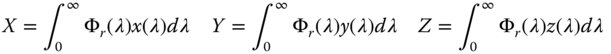 Quite significantly, the y(λ) curve follows that of the standard V(λ) curve. As for the basic photometric quantities, an input spectral radiance is transformed by integrating across the spectral range using the colour matching functions. However, instead of producing a single luminous flux value, three separate tristimulus values, X, Y, and Z are derived, as below.