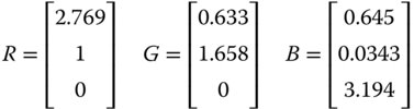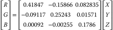 In many instances in describing colour we are interested in the effect of adding or blending colours. As a result of the three sensor types it is clear, in principle, that a linear combination of three different colours may be used to create a wide range colour sensations. The three colours themselves are described by a linear combination of the tristimulus values, X, Y, and Z and are known as primary colours. Definition of the suite of primary colours is arbitrary and established by virtue of convention. The guiding principle is that these three colours must be capable of being admixed to create as wide as possible a range of colours without recourse to negative coefficients in the linear combination. This range is referred to as a gamut. The original standard (1931 CIE) colour representation is the so-called RGB system (Red – Green – Blue) of primary colours using three standard monochromatic stimuli at 700 nm (R), 546.1 nm (G), and 435.8 nm (B). In this scheme, definition of the RGB primary colours from the tristimulus values is given by the following (X, Y, Z) vectorial representation: