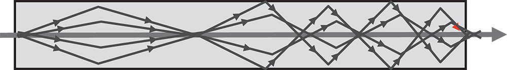 As previously set out, the path of rays through a system is governed entirely by Fermat's principle. From this point, we will apply the simplest definition of Fermat's principle and assume that the time or optical path of rays is minimised. As far as propagation through a homogeneous medium is concerned, this leads to a perhaps obvious and trivial conclusion that light travels in straight lines. In fact, this describes a specific application of Fermat's principal, known as Hero's principle, namely that light follows the path of minimum distance between two points within a homogeneous medium.
