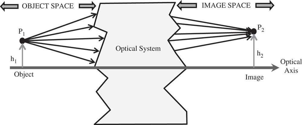We consider an ideal optical system which consists of a point source of light, the object, and an optical system that collects the light and re-directs all rays emanating from this point source or object, such that the rays converge onto a single point, the image point. At this stage, the interior workings of the optical system are undefined; the system behaves as a ‘black box’. The object is said to be located in object space and the image in image space and the pair of points are said to be conjugate points. This is illustrated in Figure 1.5.