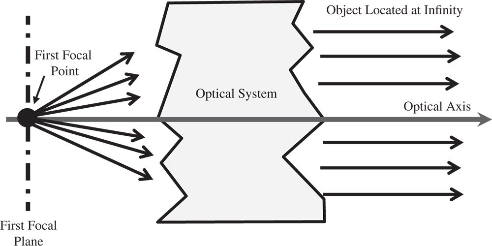 Where an image or object is located at infinity, all rays emerging from or travelling to these locations will be parallel with respect to each other. In this instance, the point located at infinity is said to be at an infinite conjugate. The corresponding conjugate point to the infinite conjugate is known as a focal point. There are two focal points. The first focal point is located in the object space with the corresponding image located at the infinite conjugate. The second focal point is located in the image space with the object placed at the infinite conjugate. Figure 1.6 depicts the first focal point: