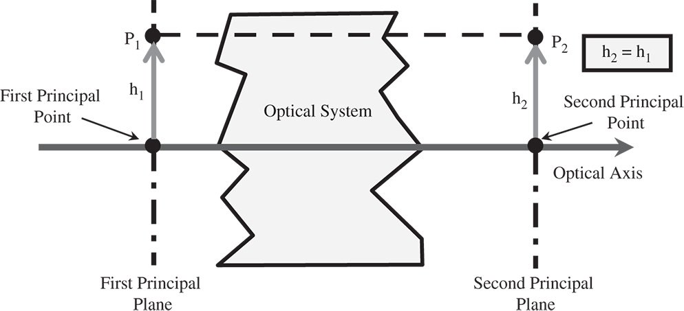 All points lying on a particular conjugate plane are associated with a specific transverse magnification, M, which is equal to the ratio of the image and object heights. For an ideal system, there exist two conjugate planes where the magnification is unity. These are known as the principal planes. Thus, there are two principal planes and the points where the optical axis intersects the principal planes are known as principal points. The first principal point (plane) is located in object space and the second principal point (plane) is located in image space. The arrangement is illustrated schematically in Figure 1.7.