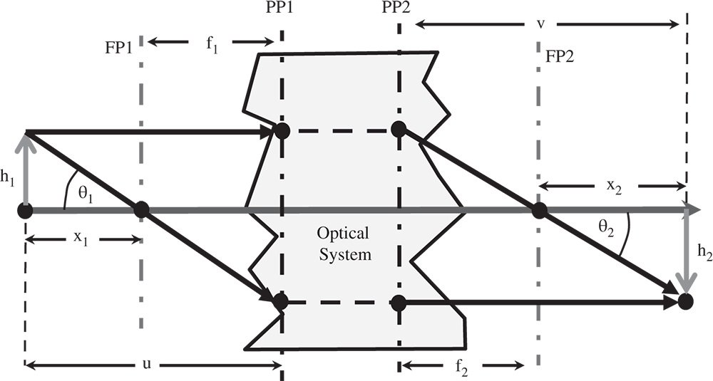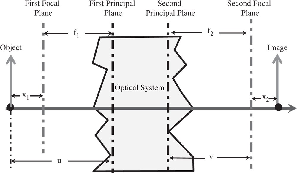 The reader might be used to ascribing a single focal length to an optical system, such as for a magnifying lens or a camera lens. However, in this general description, the system has two focal lengths. The first focal length, f1, is the distance from the first focal plane (or point) to the first principal plane (or point) and the second focal length, f2, is the distance from the second principal plane to the second focal plane. In many cases, f1 and f2 are identical. In fact, the ratio f1/f2 is equal to n1/n2, the ratio of the refractive indices of the media associated with the object and image spaces. However, this need not concern us at this stage, as the treatment presented here is entirely general and independent of the specific attributes of components or media.