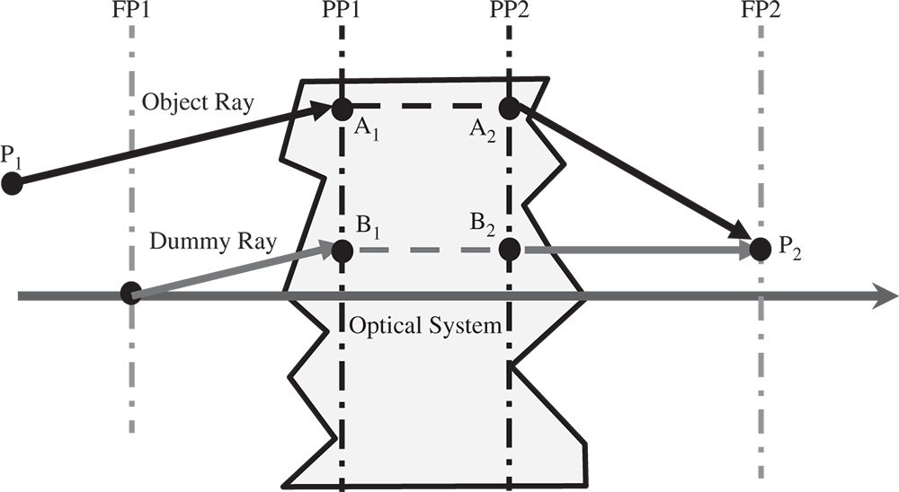 We see how input rays originating in the object space are mapped onto the image space for specific scenarios where the object is located at the input focal plan, the infinite conjugate, or the first principal plane. How can this be extended to determine the output path of any input ray? The general principle is set out in Figure 1.9. First, the input ray is traced from point P1 as far as its intersection with the (first) principal plane at A1. We know that this point, A1, is conjugated with point A2, lying at the same height at the second principal plane. This follows directly from the definition of principal planes. Second, we draw a dummy ray originating from the first focal point, f1, but parallel to the input ray and trace it to where it intersects the first principal plane at B1. We know that B1 is conjugated with point B2, lying at the same height on the second principal plane. Since this ray originated from the first focal point, its path must be parallel to the optical axis in image space and thus we can trace it as far as the second focal plane at P2. Finally, since the object ray and dummy rays are parallel in object space, they must meet at the second focal plane in the image space. Therefore, we can trace the image ray to point P2, providing a complete definition of the path of the ray in image space.