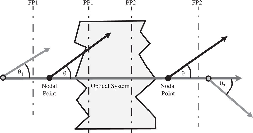 The angular magnification of an optical system is the ratio of the angle (with respect to the optical axis) of a ray in image space and that of its conjugate in object space. There exists a pair of conjugate points lying on the optical axis where, for all possible rays, the angular magnification is unity. These are the nodal points. The first nodal point is located in object space and the second nodal point is located in image space. This is set out in Figure 1.10, where for a general conjugate pair, the angular magnification, α, is equal to θ2/θ1. For the nodal points, θ2 = θ1; that is to say, the angular magnification is unity. Where the two focal lengths are identical, or the object and image spaces are within media of the same refractive index, the nodal points are co-located with the principal points.
