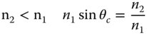 Snell's law is, in fact, a direct consequence of Fermat's principle. The reader may wish to derive this through the application of differential calculus. In finding the optimum path from a point in one medium to a point in another medium, the ray will attempt, as far as possible, to minimise its path through the higher index medium. Snell's law thus represents the minimum optical path condition in this instance. Where the ray passes from a high index material to a low index material, there exists an angle of incidence where the angle of refraction is 90°. This angle is known as the critical angle and, for angles of incidence beyond this, the ray is totally internally reflected. The critical angle, θc, is given by: