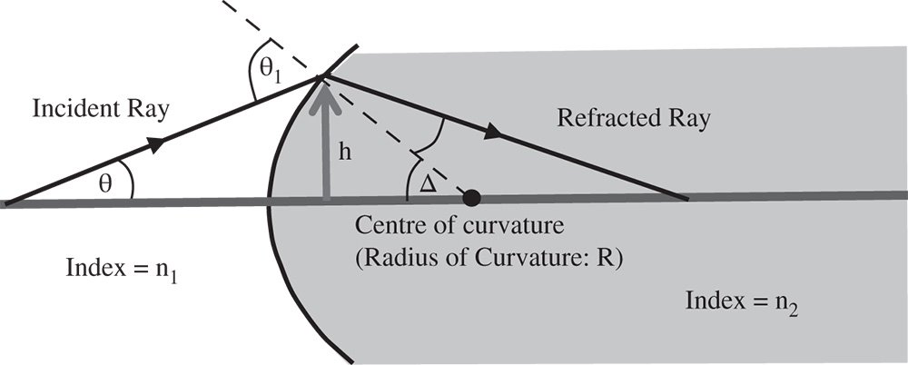 There are two terms on the RHS of Eq. (1.14). The first term, depending on the input angle θ is of the same form as Snell's law (for small angles) for a plane surface. The second term, which gives an angular deflection proportional to the height, h, and inversely proportional to the radius of curvature R, provides a focusing effect. That is to say, rays further from the optic axis are bent inward to a greater extent and have a tendency to converge on a common point. The sign convention used here assumes that positive height is vertically upward, as displayed in Figure 1.13 and a positive spherical radius corresponds to a scenario in which the centre of the sphere lies to the right of the point where the surface intersects the optical axis. Finally, a positive angle is consistent with an increase in ray height as it propagates from left to right in (1.13).