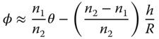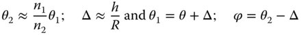 If we now wish to calculate the angle φ in terms of θ, this process is, in principle, straightforward. We need also to take into account the angle the surface normal makes with the optical axis, Δ, and the radius of curvature, R, of the spherical surface. However, calculation is a little unwieldy, so therefore we make the simplifying assumption that all angles are small and:
