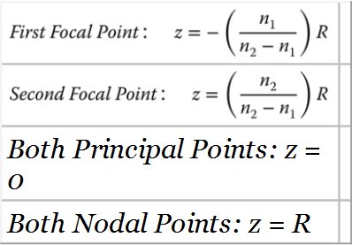 Equation (1.14) can be used to trace any ray that is incident upon a spherical refractive surface. If this surface is deemed to comprise ‘the optical system’ in its entirety, then one can use Eq. (1.14) to calculate the location of all Cardinal Points, expressed as a displacement, z along the optical axis. Positive z is to the right and the origin lies at the intersection of the optical axis and the surface. The Cardinal points are listed below. Cardinal points for a spherical refractive surface