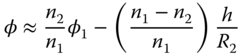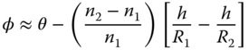 So, in the biconvex lens illustrated in Figure 1.14, the first surface has a positive radius of curvature and the second surface has a negative radius of curvature. The lens is made from a material of refractive index n2 and is bounded by two surfaces with radius of curvature R1 and R2 respectively. It is immersed totally in a medium of refractive index, n1 (e.g. air). In addition, it is assumed that the lens has negligible thickness (the thin lens approximation). Of course, as for the treatment of the single curved surface, we assume all angles are small and θ ∼ sinθ. First, we might calculate the angle of refraction, φ1, produced by the first curved surface, R1. This can be calculated using Eq. (1.14):