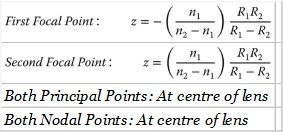 Of course, since the refractive indices of the object and image spaces are identical, the nodal points are located in the same place as the principal points. If we take the example of a biconvex lens where R2 = −R1, then: