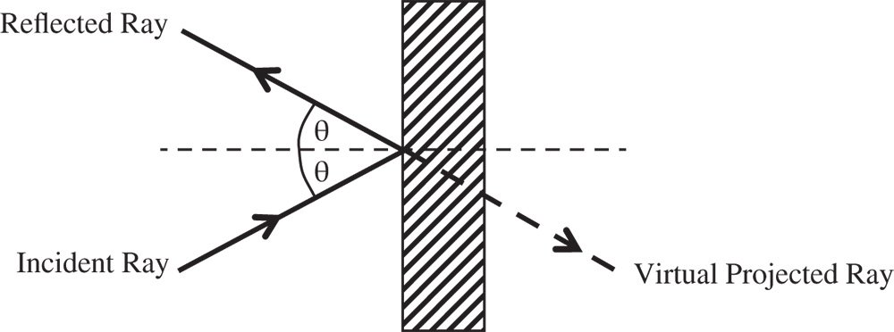 The virtual projected ray shown in Figure 1.15 illustrates an important point about reflection. If one considers the process as analogous to refraction, then a mirror behaves as a refractive material with an index of −1. This, in itself has an important consequence. The image produced is inverted in space. As such, there is no combination of positive magnification and pure rotation that will map the image onto the object. That is to say, a right handed object will be converted into a left handed image. More generally, if an optical system contains an odd number of reflective elements, the parity of the image will be reversed. So, for example, if a complex optical system were to contain nine reflective elements in the optical path, then the resultant image could not be generated from the object by rotation alone. Conversely, if the optical system were to contain an even number of reflective surfaces, then the parity between the object and image geometries would be conserved.