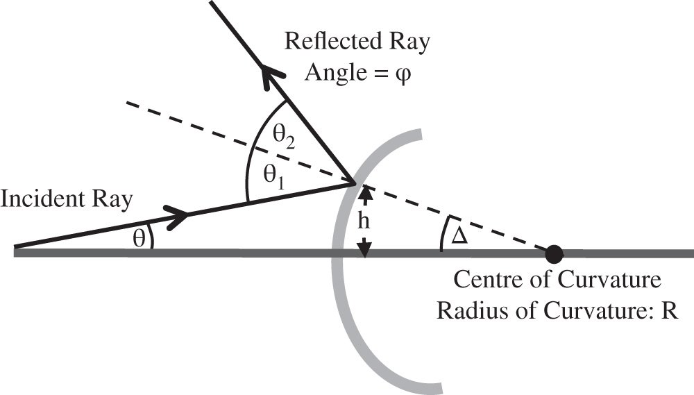 The incident ray is at an angle, θ, with respect to the optical axis and the reflected ray is at an angle, ϕ to the optical axis. If we designate the incident angle as θ1 and the reflected angle as θ2 (with respect to the local surface normal), then the following apply, assuming all relevant angles are small: